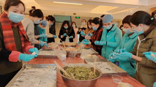 活动现场,各科室与手拉手荣军紧围一桌,大家一起动手,一边学,一边包,每个人脸上都喜气洋洋,处处洋溢着节日的气氛,场面温馨。