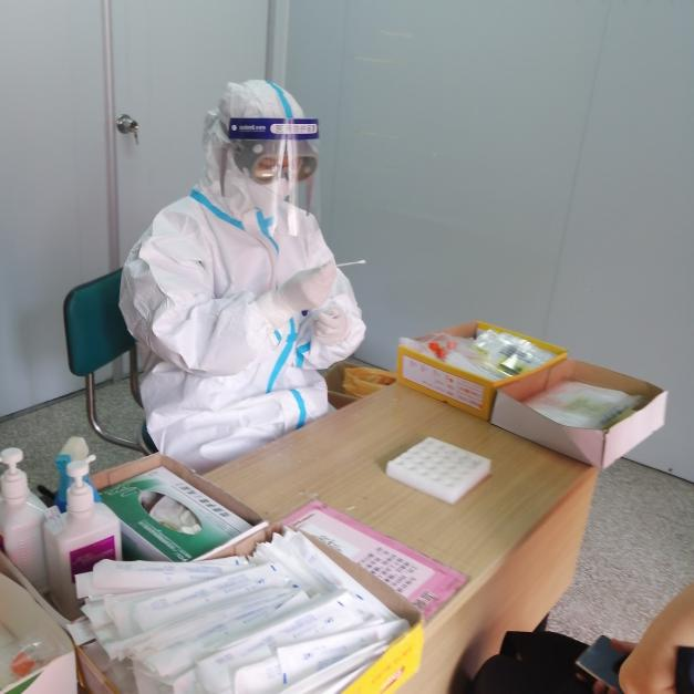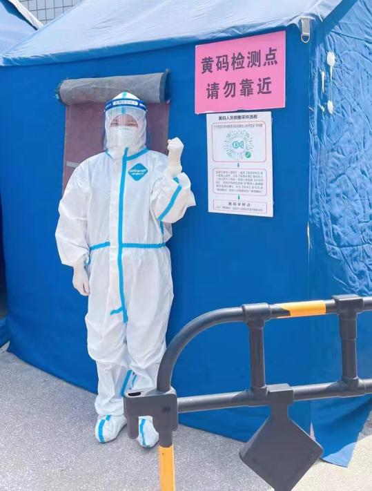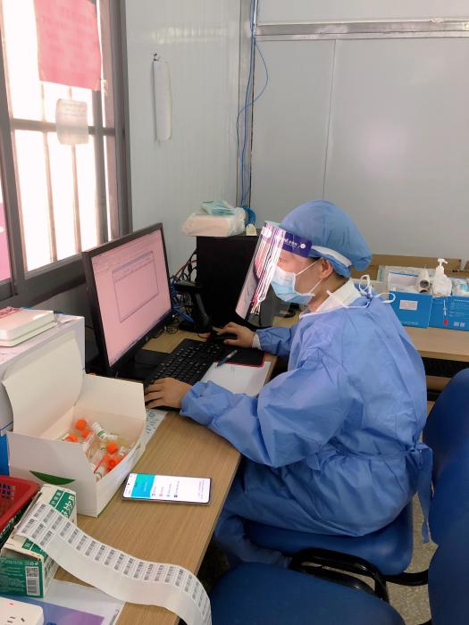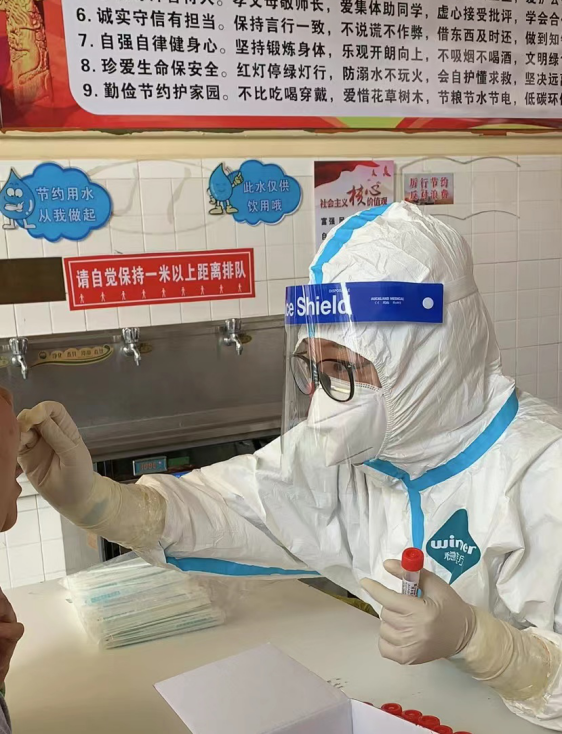 在门诊一楼,你总能看到一个忙碌的身影,熟练又快速地在导诊、核酸采集及信息登记等工作岗位来回穿梭,对来访就诊人员进行分诊,参与每日门急诊体温测量、黄码区域人员核酸采集以及消毒隔离等工作。在门诊岗位,虽然暴露风险比较高,但是她总是积极响应,对疫情毫无畏惧。